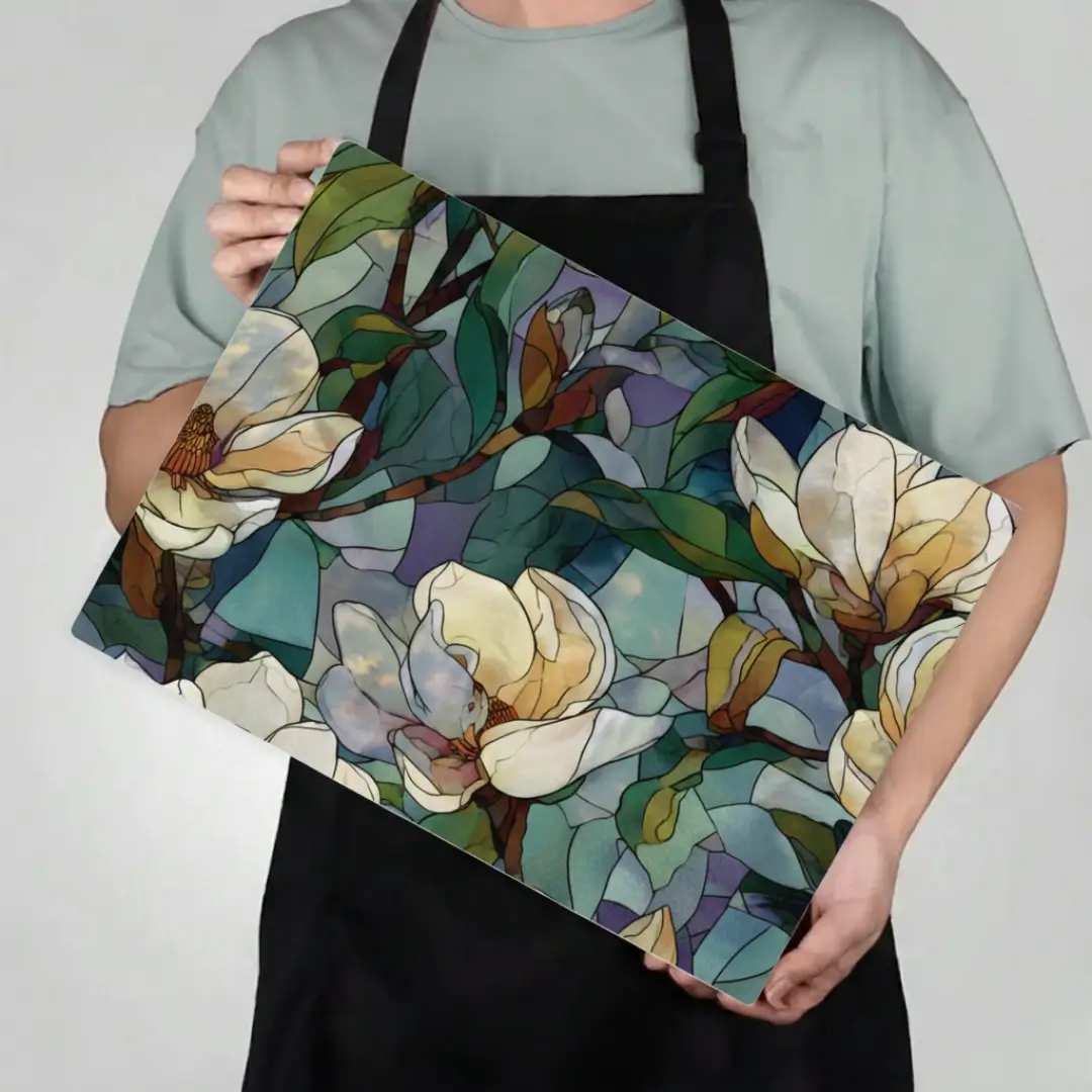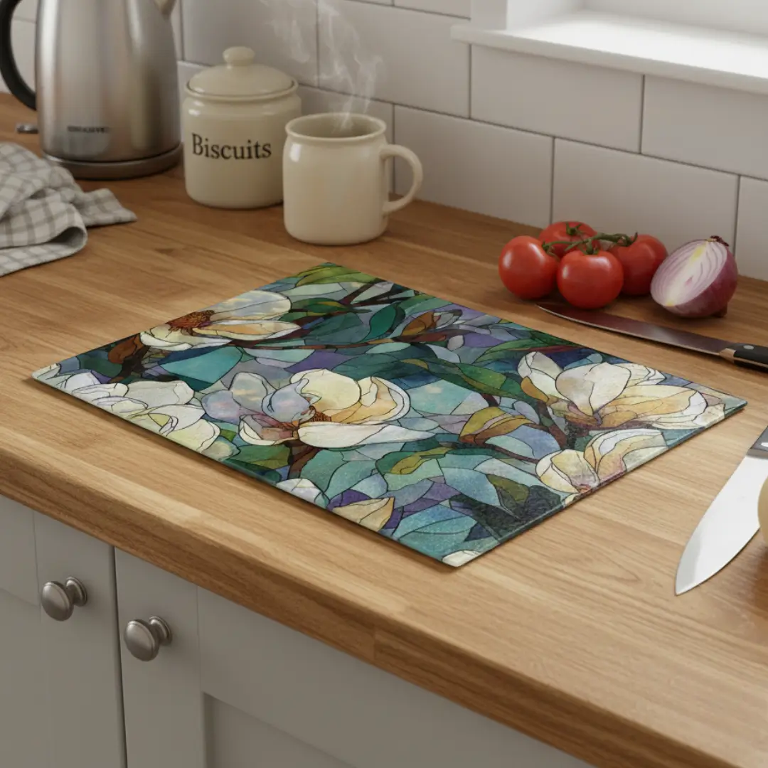 A premium toughened glass chopping board featuring elegant cream magnolia stained-glass artwork. Heat-resistant, hygienic, and perfect for both food prep and stylish kitchen décor.