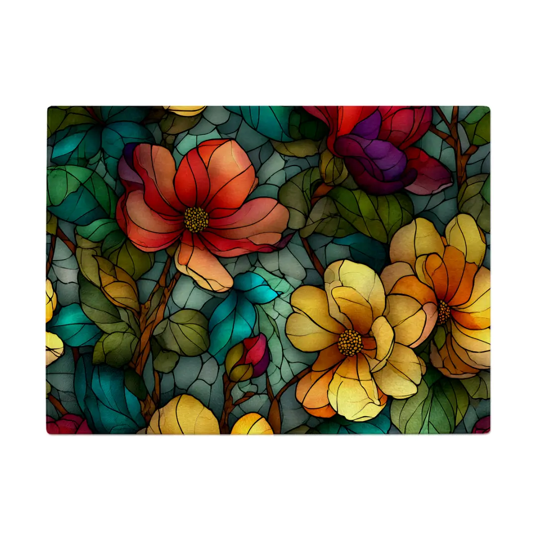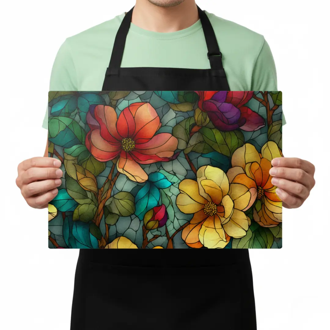A vibrant toughened glass chopping board featuring warm sunset-style magnolia stained-glass artwork. Heat-resistant, durable, and ideal for both prepping and stylish serving.